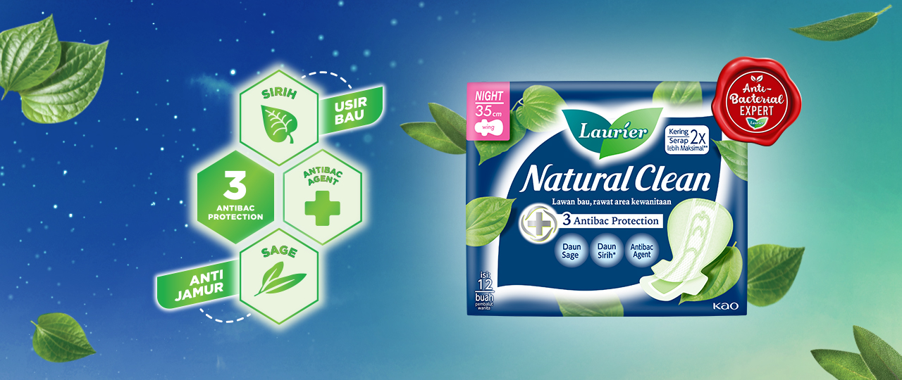 Selama menstruasi, supaya stay clean dan bebas dari becek, bau, dan bakteri, gunakan Laurier Natural Clean. Pembalut antibakterial dengan 3 antibac protection: kandungan Daun Sirih yang dapat mengusir bau, ekstrak Daun Sage yang dikenal sebagai anti jamur, dan Antibac Agent yang dapat melawan pertumbuhan bakteri. Laurier Natural Clean dilengkapi dengan Fiber Dry Tech sehingga dapat menyerap lebih cepat dan permukaannya 2x lebih kering. No more becek, bebas bau check!