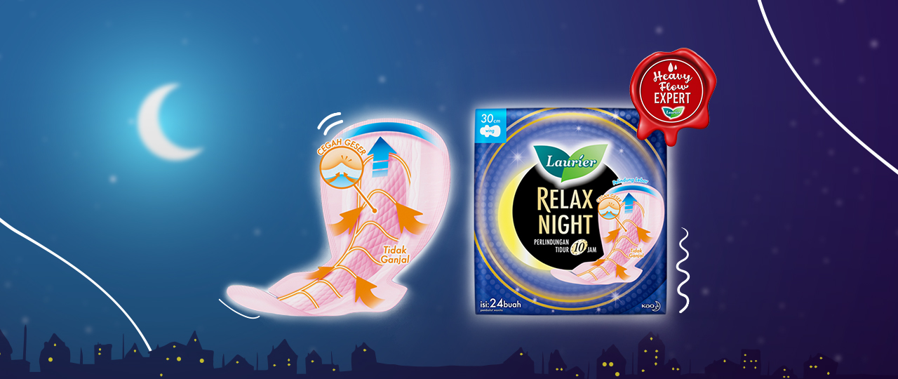 Selain itu, rasa cemas akan bocor juga bisa membuatmu kesulitan mendapat tidur yang berkualitas. Untuk mengatasinya, kamu bisa menggunakan Laurier Relax Night, yaitu pembalut malam dengan inti penyerap instant yang mampu menyerap cairan dan gumpalan dengan maksimal sehingga bebas dari bocor hingga 10 jam. Dengan pelindung belakang yang lebar dan struktur bebas celah cegah bocor pada posisi tidur apapun. Sayap pelindungnya akan mencegah pembalut bergeser dan tidak menyebar di permukaan, sehingga memaksimalkan perlindungan dari kebocoran.