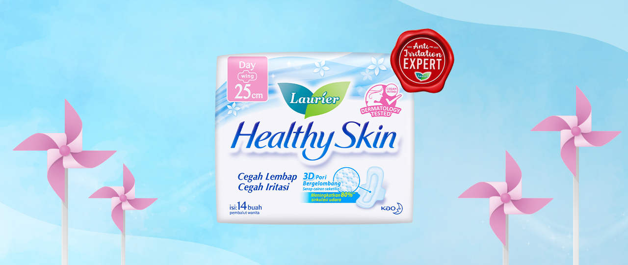 Selain itu, untuk kulit area kewanitaan yang sensitif dan terkadang iritasi, gunakan Laurier Healthy Skin. Pembalut pertama yang teruji klinis aman digunakan untuk yang memiliki kulit sensitif dan dapat menjaga kesehatan area kewanitaan. Dengan inovasi baru 3D Pori Bergelombang membuat permukaan pembalut tidak bersentuhan sepenuhnya dengan kulit area kewanitaan sehingga meningkatkan 80% sirkulasi udara. Laurier Healthy Skin juga menyerap cairan seketika sehingga permukaan pembalut tetap kering. Selain itu, Laurier Healthy Skin juga mudah dicuci setelah pemakaian.